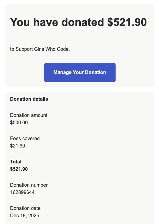I'm kicking things off by donating $500 Girls Who Code (receipt).